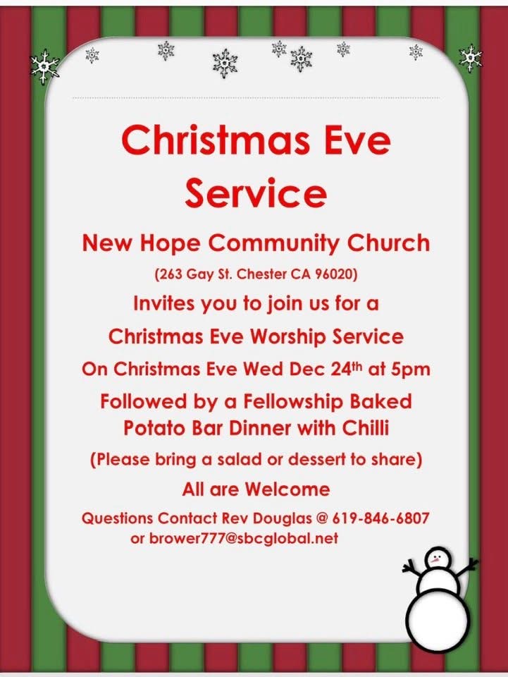 | 12/4/2025 | Join us for the Food Pantry’s wildly popular donation-based Community Suppers, serving the Lake Almanor area from Fall through Spring at Veterans Memorial Hall! These heartwarming dinners bring the entire town of Chester together to enjoy amazing, home-cooked meals while raising thousands of dollars annually to support the Food Pantry’s mission to fight hunger. Come for the food, stay for the community spirit, and help make a difference! Dinner is served between 5-6pm. more info... |
