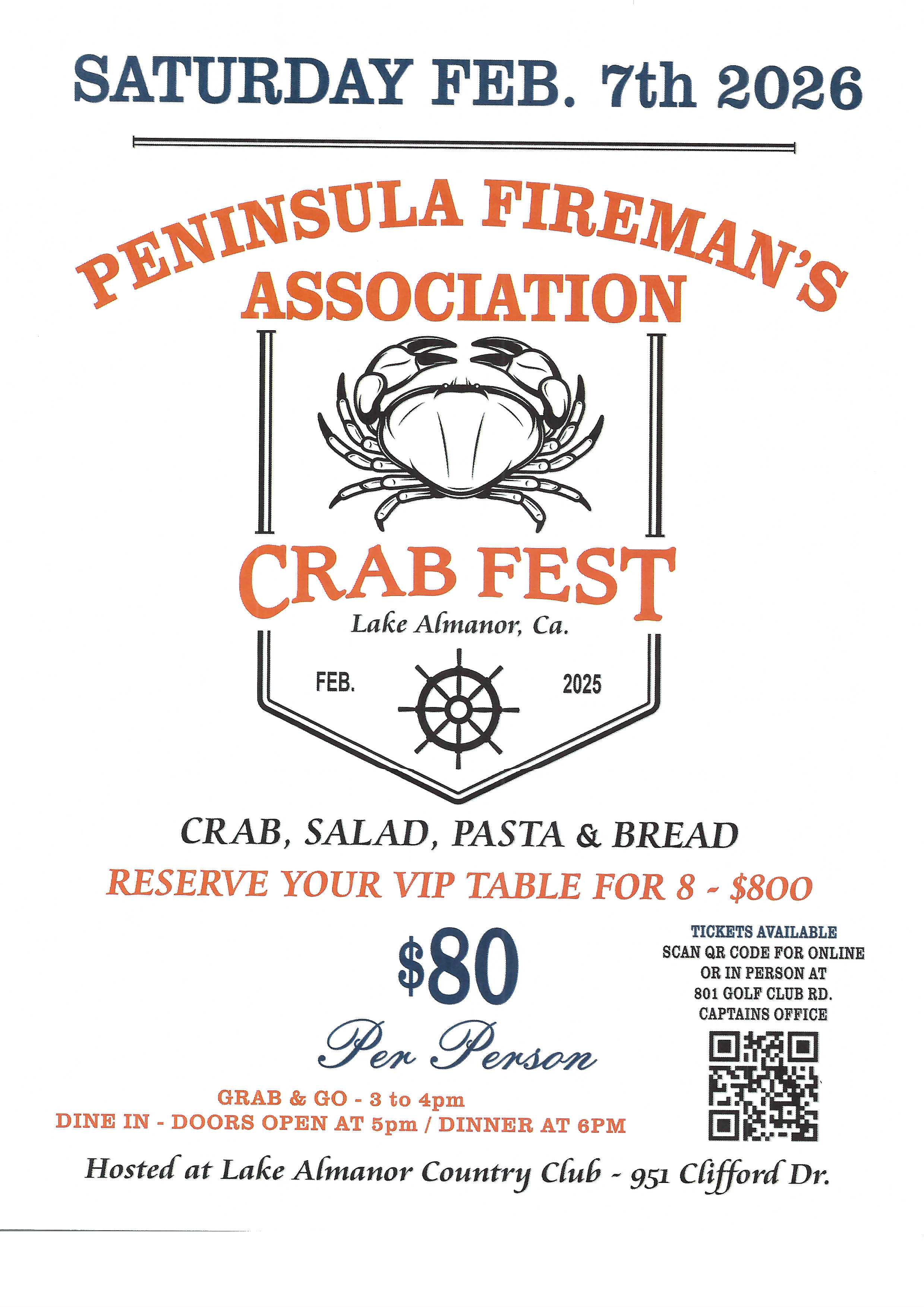 | 2/7/2026 | Penisula Fire Dept CrabFest Ticket on Sale http://lapfma.square.site |
