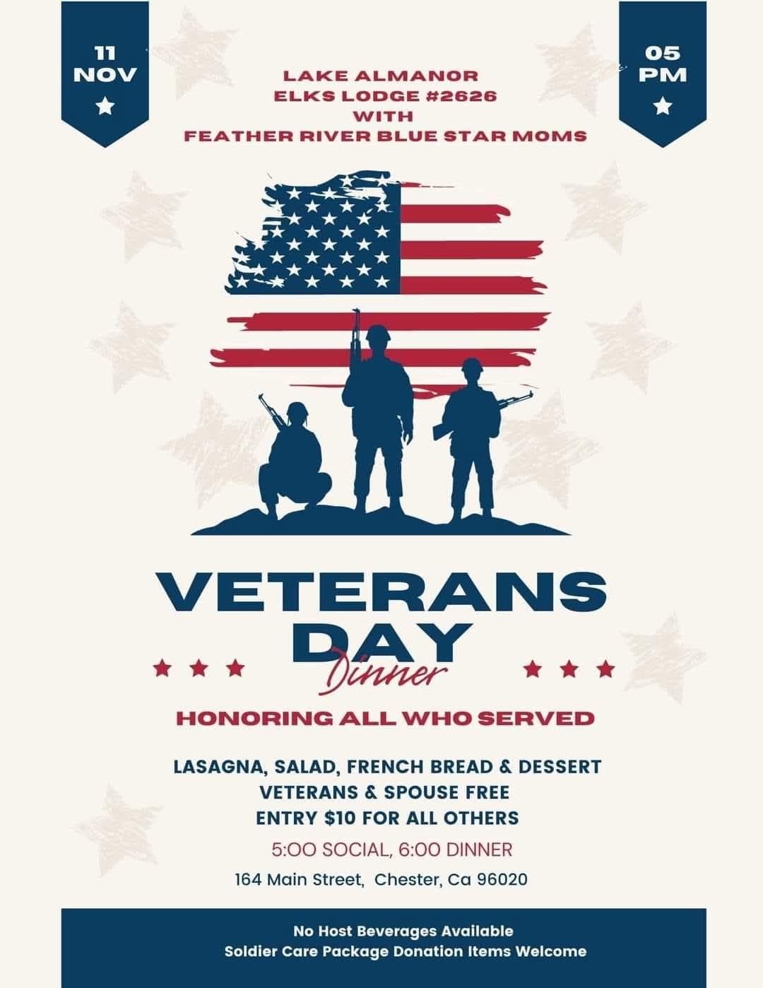 Join us for the Food Pantry’s wildly popular donation-based Community Suppers, serving the Lake Almanor area from Fall through Spring at Veterans Memorial Hall! These heartwarming dinners bring the entire town of Chester together to enjoy amazing, home-cooked meals while raising thousands of dollars annually to support the Food Pantry’s mission to fight hunger. Come for the food, stay for the community spirit, and help make a difference! Dinner is served between 5-6pm.11/24/2025